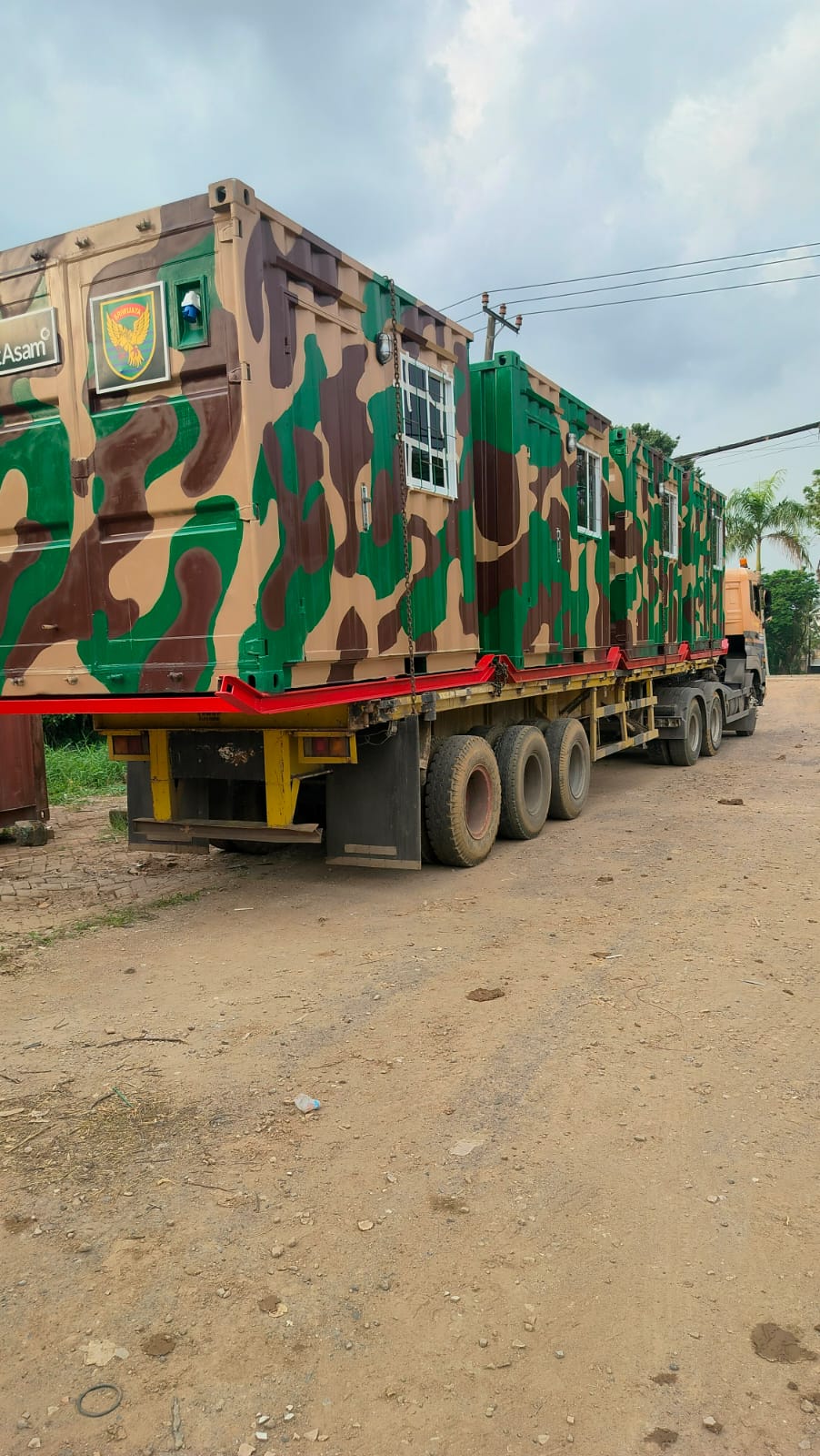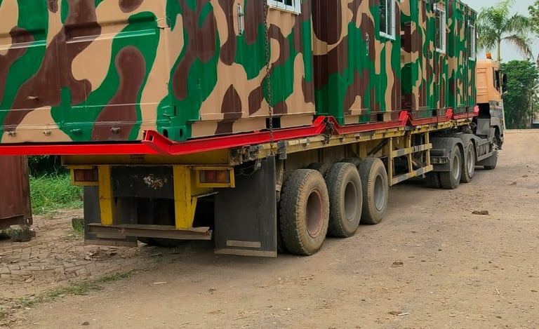 📸 Deskripsi Foto: Dokumentasi menampilkan 4 unit kontainer 10 feet berwarna segar dan kokoh sedang dimuat ke atas truk untuk dikirim ke Tanjung Enim. Tampak jelas detail skidding baja di bawah unit, serta desain kompak dengan pintu dan jendela siap pakai.