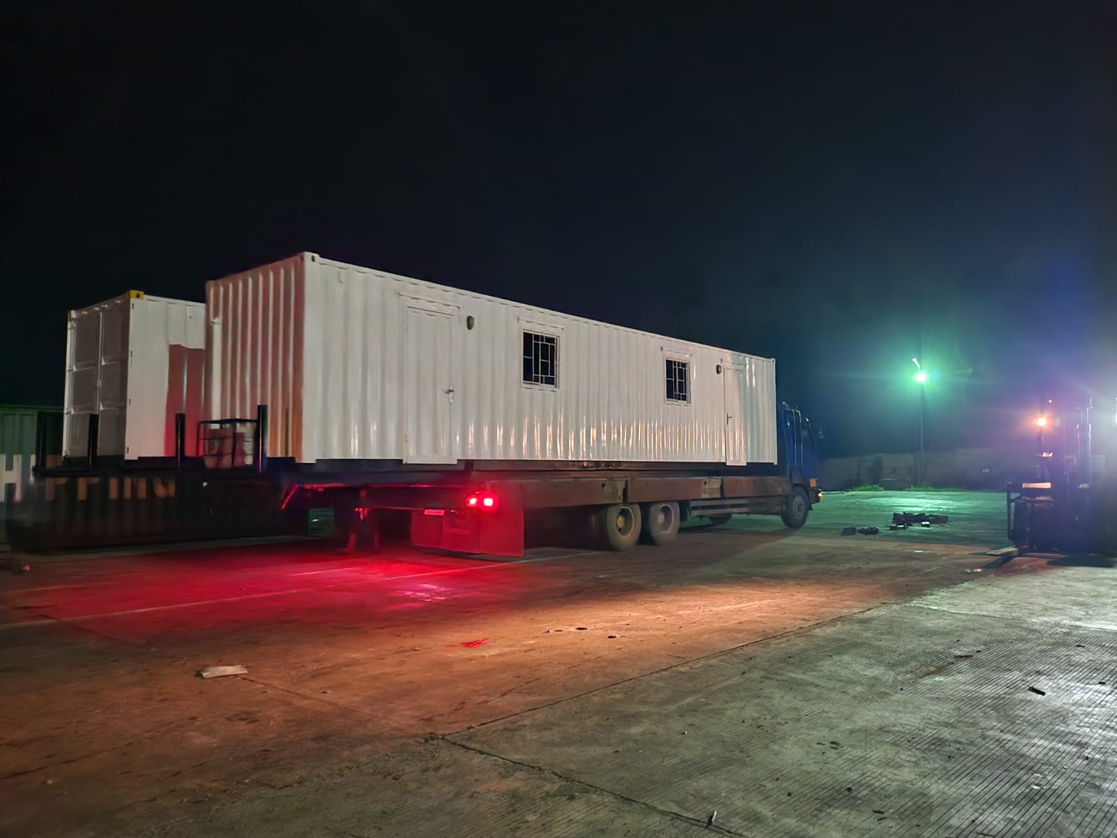 Langit malam menjadi saksi bisu perjalanan panjang ini. Kontainer office 40 feet, dengan cat barunya yang mengilap, tampak megah di atas trailer. Sesekali, lampu mobil dari arah berlawanan menyilaukan, seolah memperlihatkan sekilas bayangan dari apa yang sedang dibawa—sebuah kantor yang akan segera berubah menjadi pusat komando lapangan, tempat keputusan penting diambil, dan tempat pekerjaan dimulai.